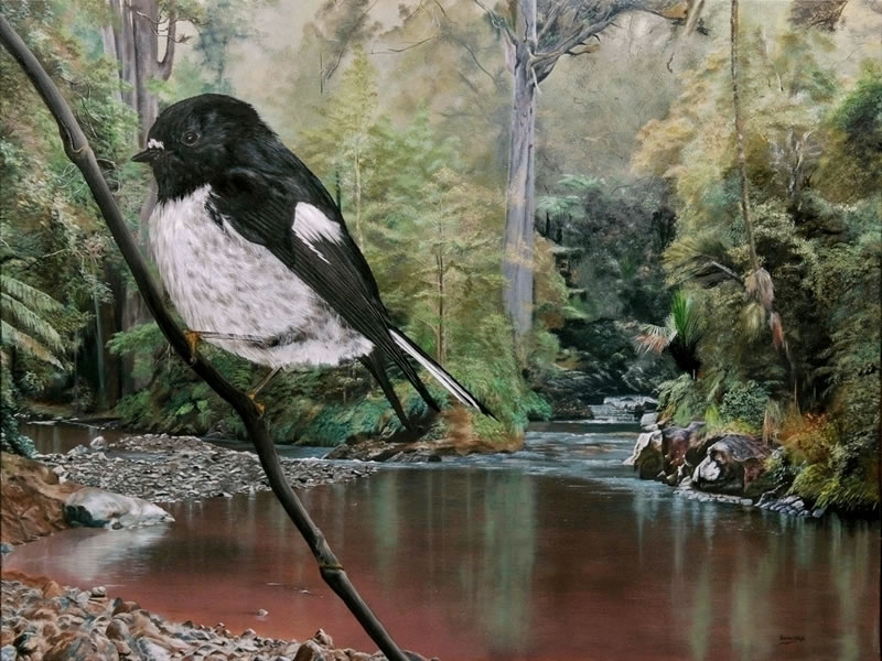 A Tomtit (Miromiro) on a Supplejack vine in Waipoua Forest, New Zealand.